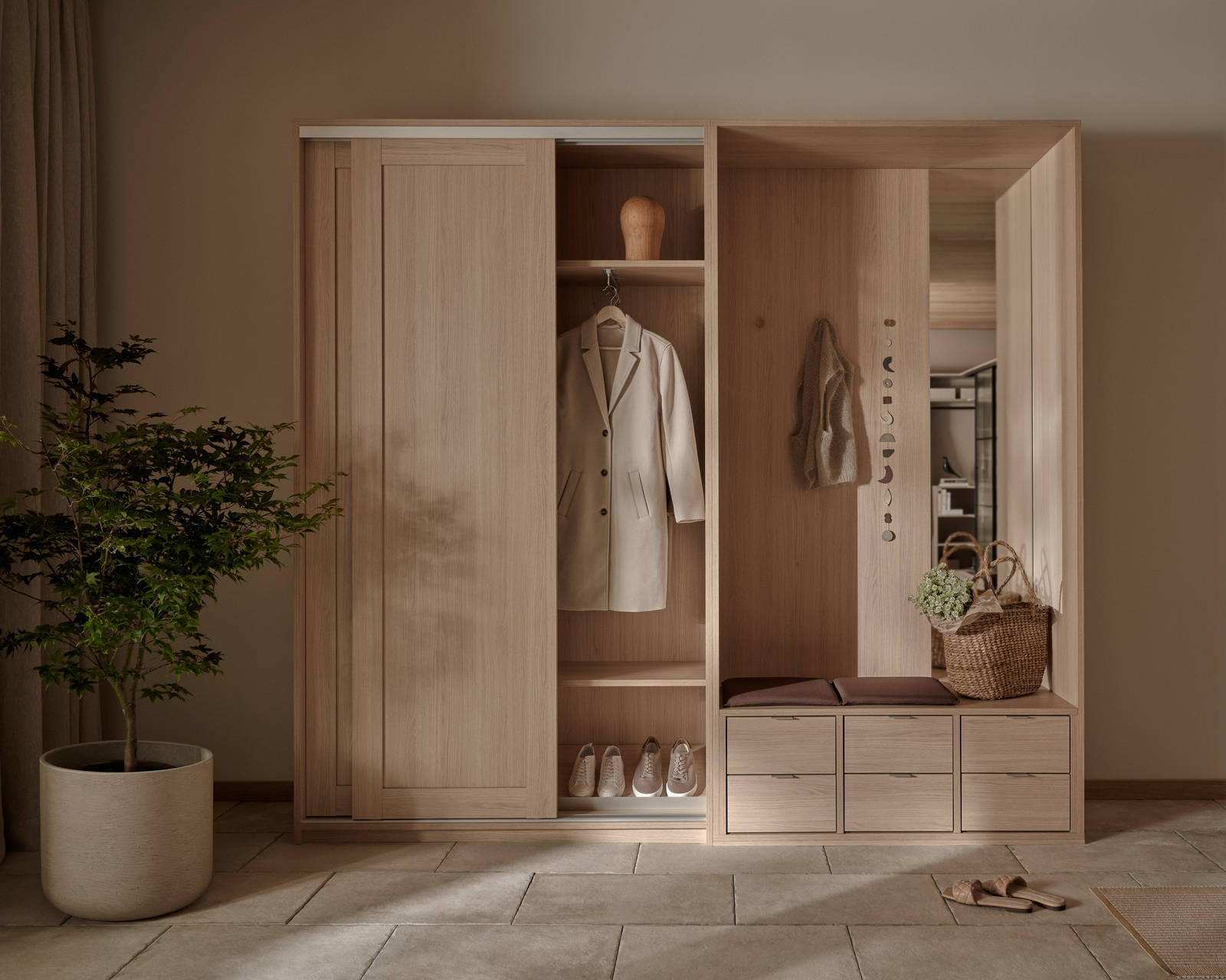 Vaxholm passar utmärkt som elegant rumsavdelare i vardagsrummet eller som snygg front på en walk-in-lösning. Komplettera med en elegant inredning med funktionella lösningar och mycket förvaring, så har du dina drömmars garderob.