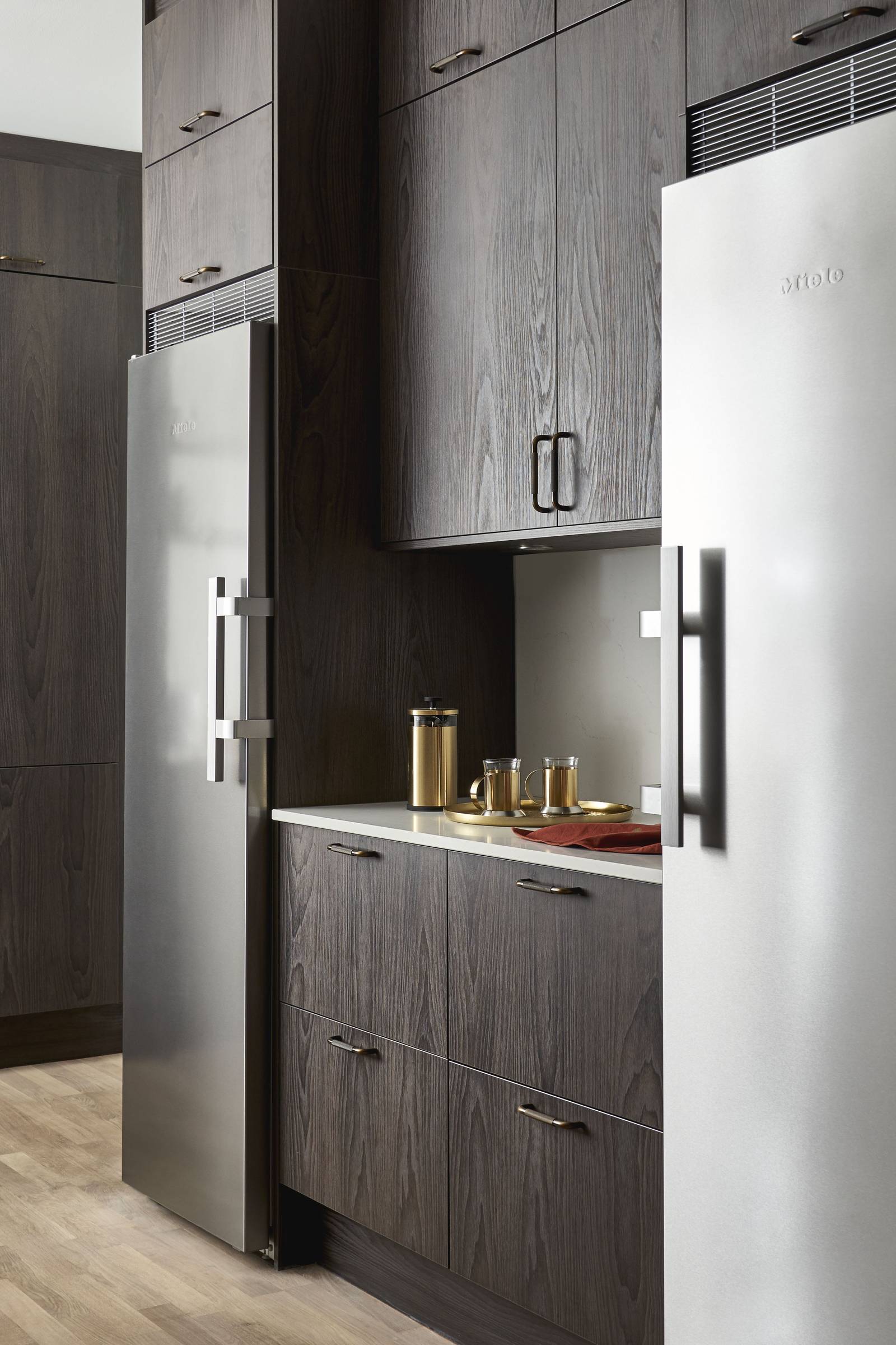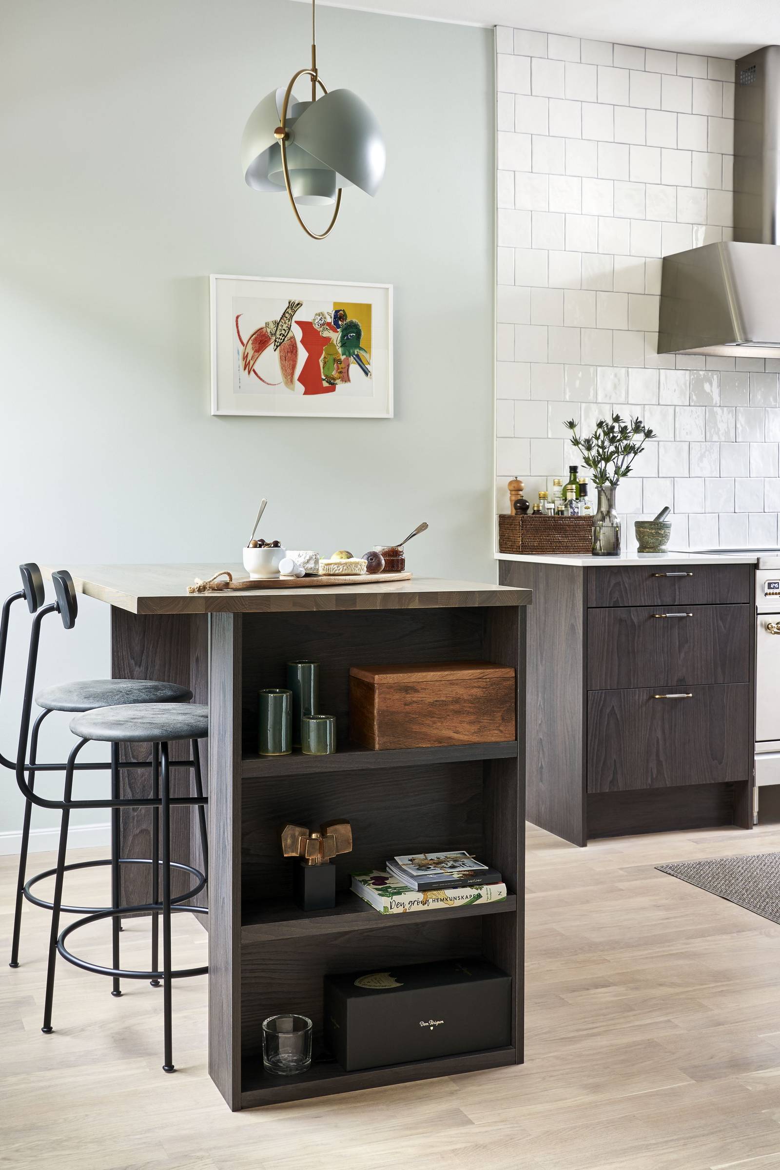 De hade en tydlig tanke om hur köket skulle se ut, även om detaljerna kom i efterhand. Det tidigare köket var helt vitt och nu sökte de en kontrast till det, vilket resulterade i ett ganska enkelt, mörkare kök med rena ytor.