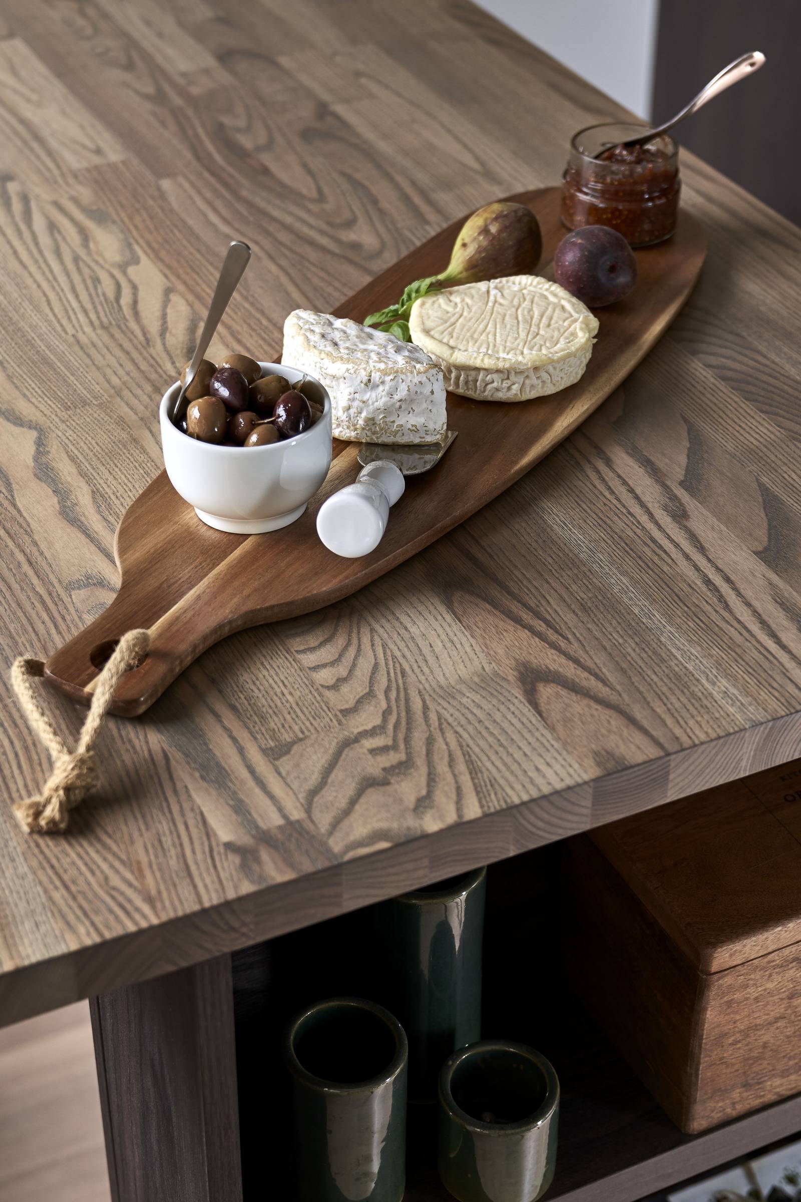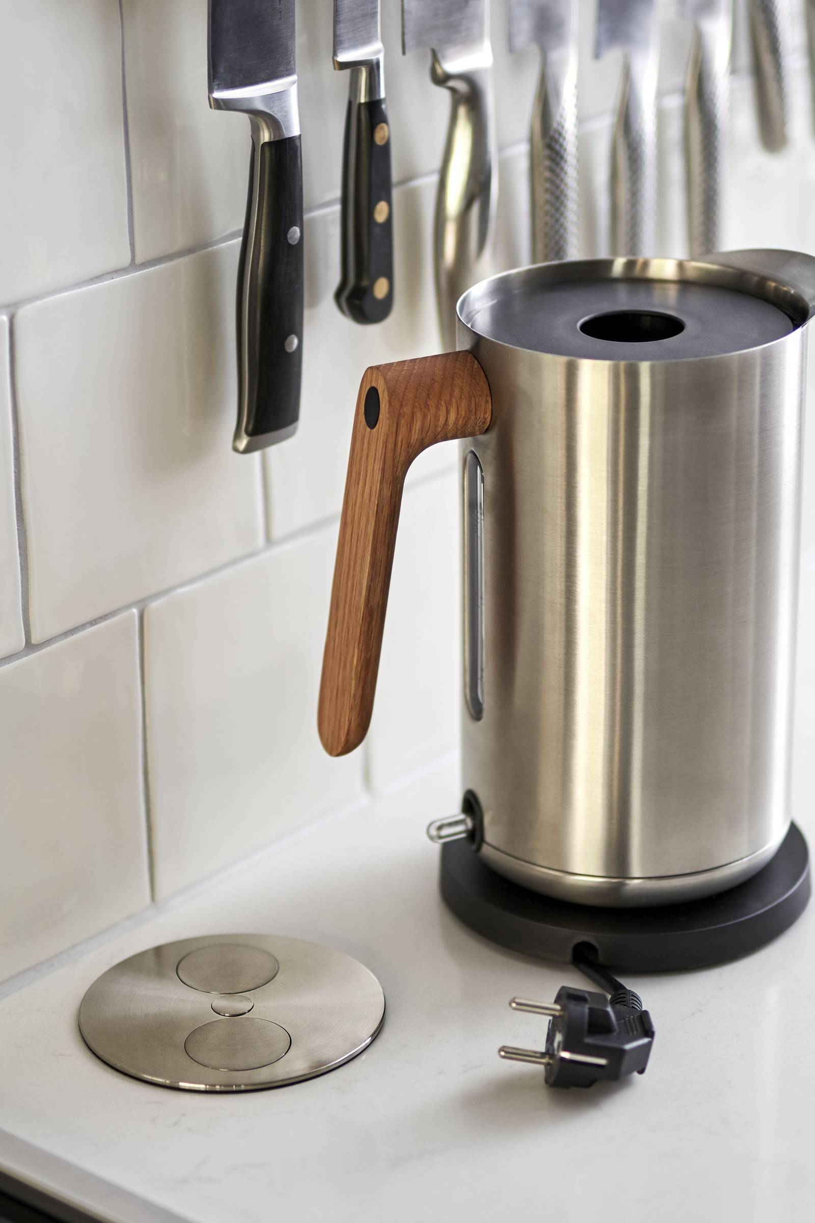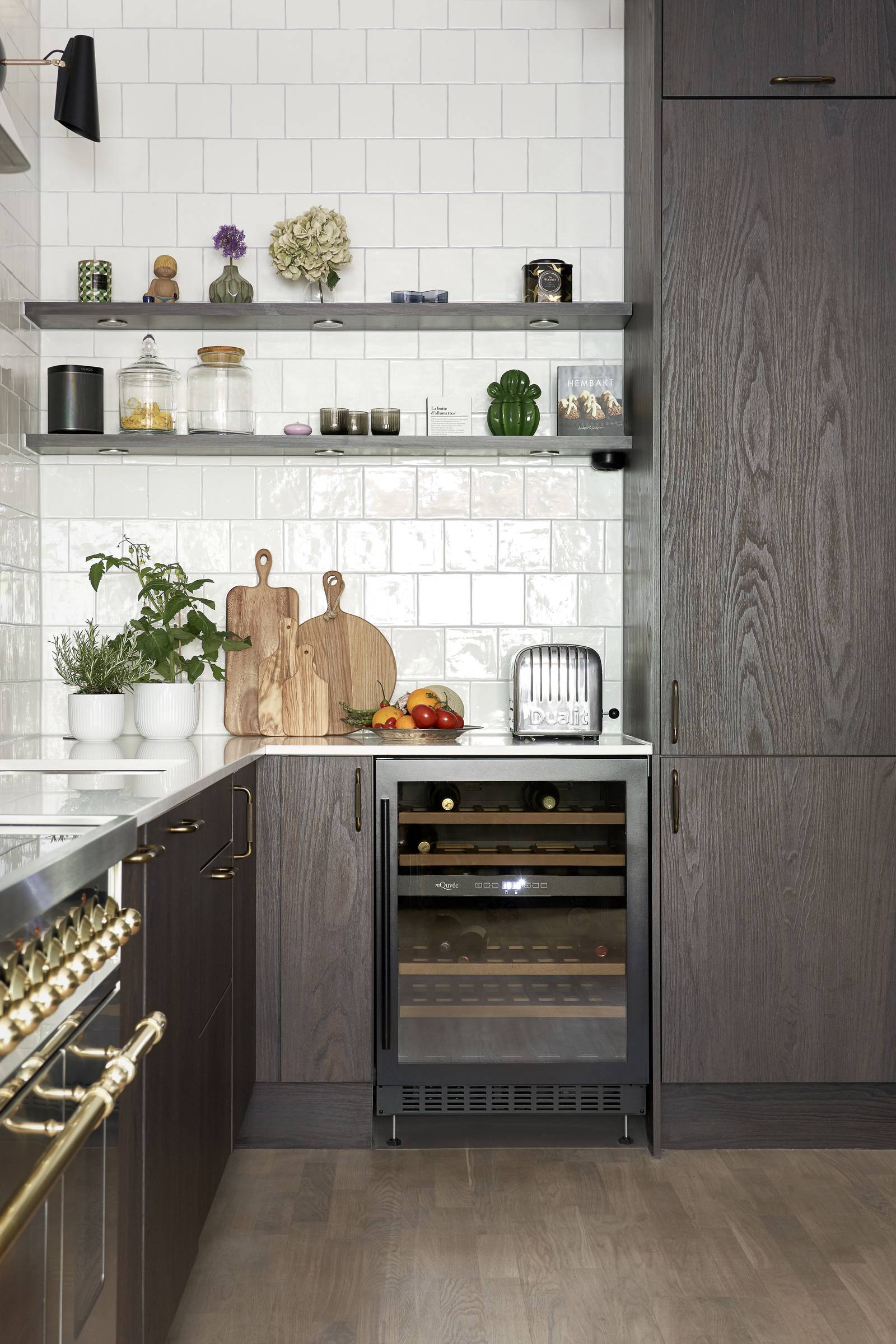 – Twist eluttag som är placerade i bänkskivan på tre ställen är en riktigt smart lösning för att minimera synliga, oftast lite tråkiga detaljer som eluttag. Utdragbart inrede till höger om spisen för att ha kryddor, oljor mer lättillgängligt. Vi valde även att inte ha några konsoler på de öppna hyllorna för att ge en mer svävande känsla.