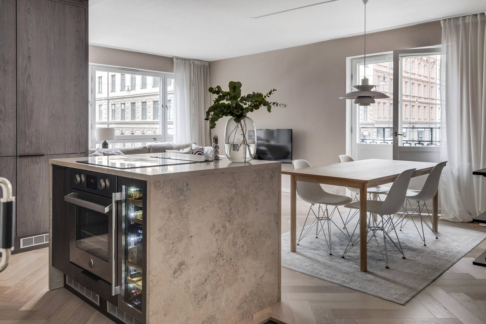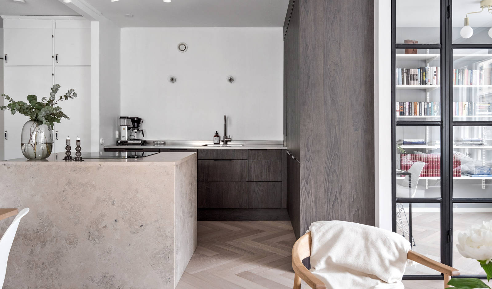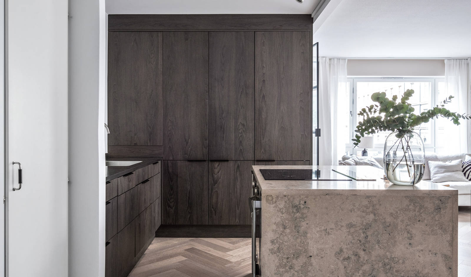 De var tidigt överens om att de ville ha ett stilrent kök med strama linjer. ”I vår tidigare lägenhet hade vi ett kök i bistrostil, med klassiskt vitt kakel och stekpannor hängande över spisen. Nu ville vi ha något nytt”, berättar Hannes. ”Till en början var vi lite rädda för att välja ett mörkt kök, men eftersom lägenheten var väldigt ljus, med stora fönster i två väderstreck, så visade det sig att valet blev helt rätt”, fortsätter Hannes.