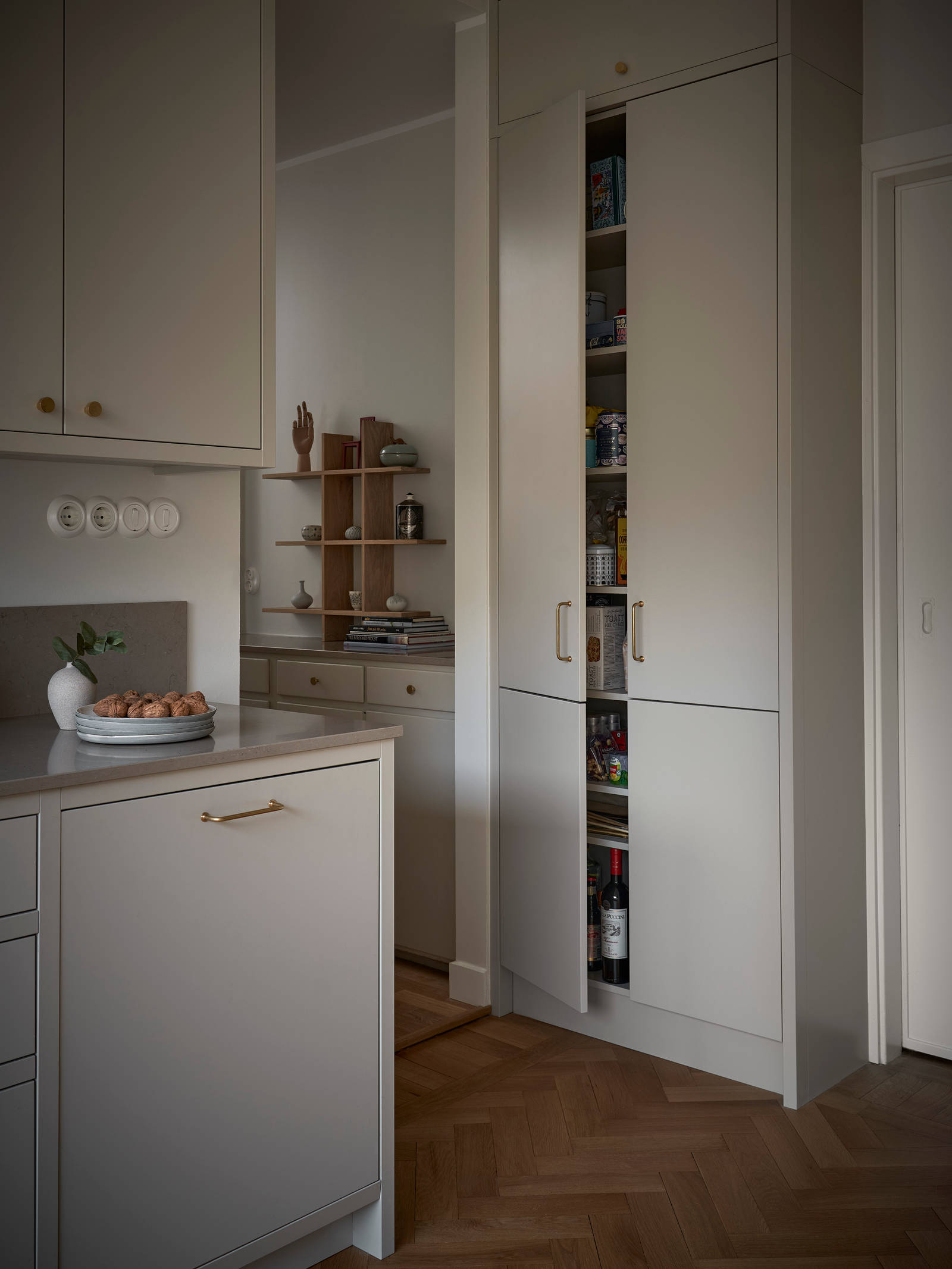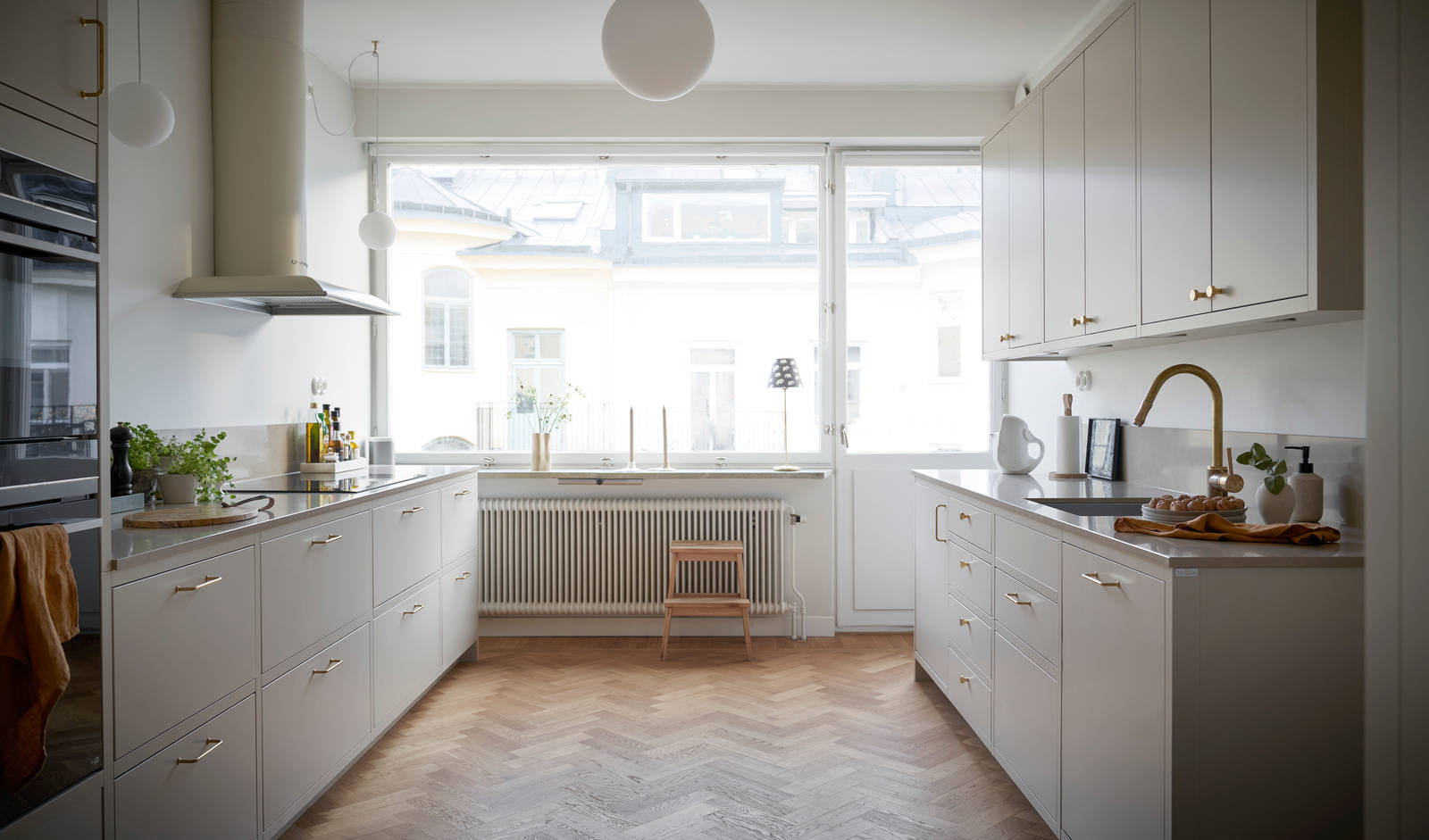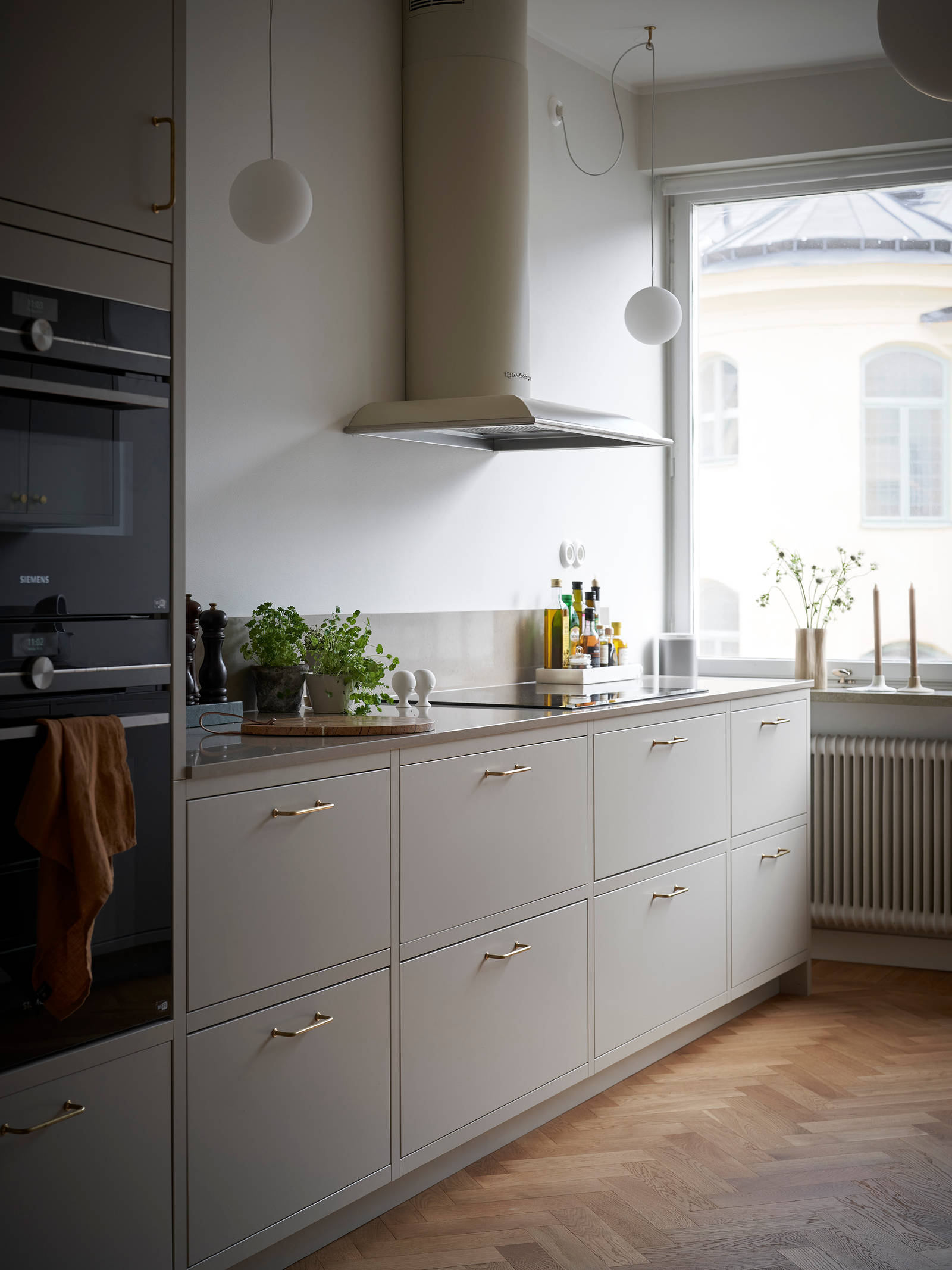 Målbilden för hur lägenheten skulle renoveras var tydlig. Den ursprungliga känslan skulle bevaras men anpassas med sociala ytor och ett effektivt kök. Det nya köket flyttades till den ursprungliga matsalen där det fanns tillgång till en balkong som vetter mot vackra innergårdar. ”Där kan vi fika när vädret så tillåter. Vi ville ta tillvara det unika fönstret som ger en fantastisk rymd och ljusinsläpp i köket. Det enda som finns kvar av den gamla matsalen är det vackra parkettgolvet som vi slipade och mattlackade.” konstaterar Benny.