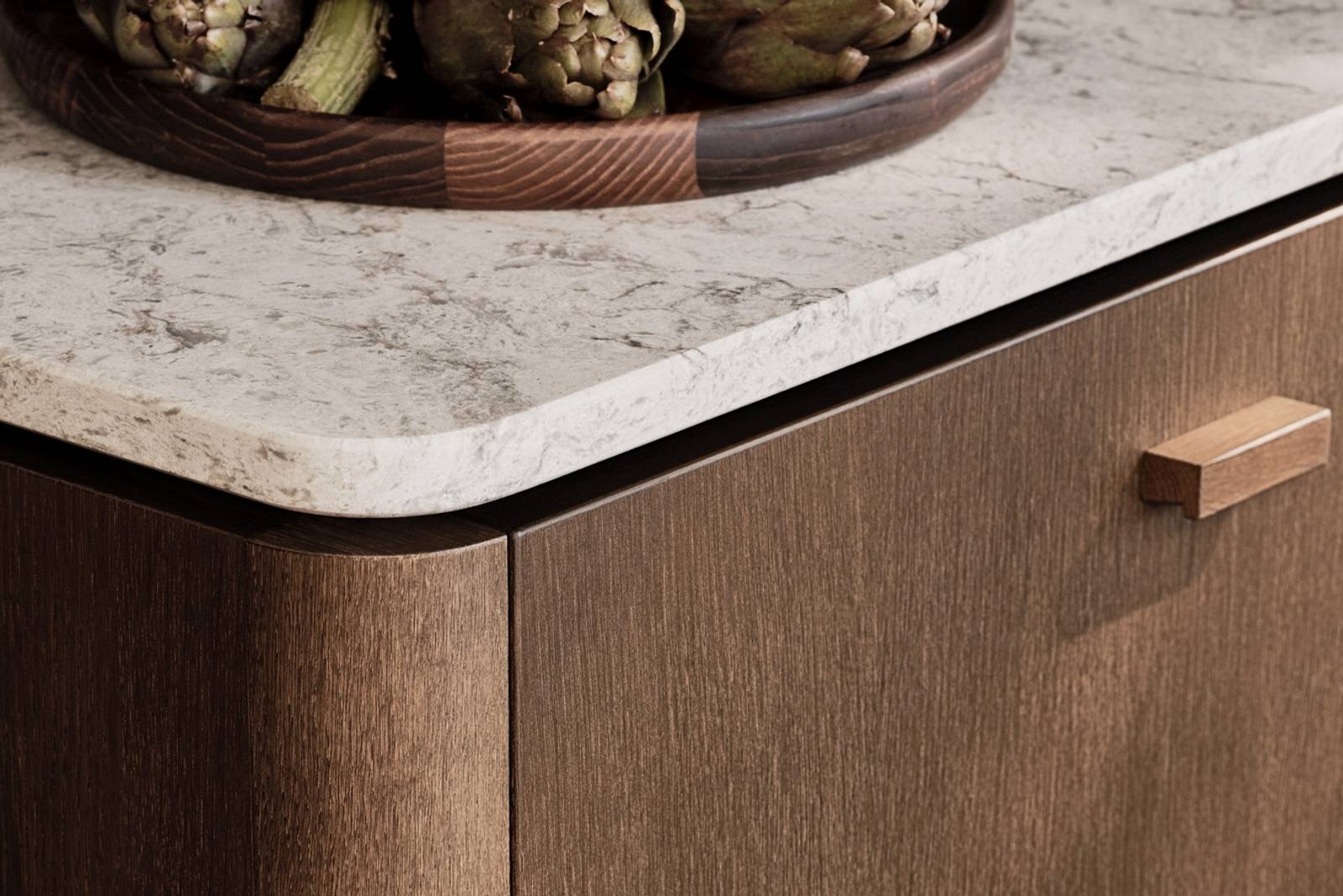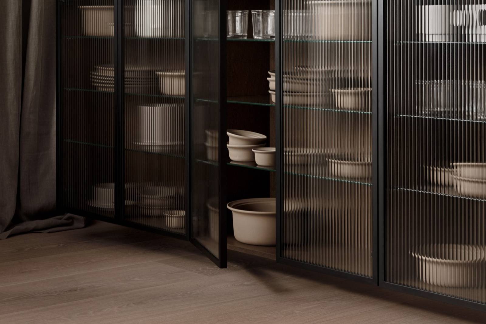 Rundade kanter och nätta väggskåp med räfflad vitrin. Köksdelar med en mer solid design ger en skulptural, elegant känsla där mjukt matchas med hårt för en perfekt balans.