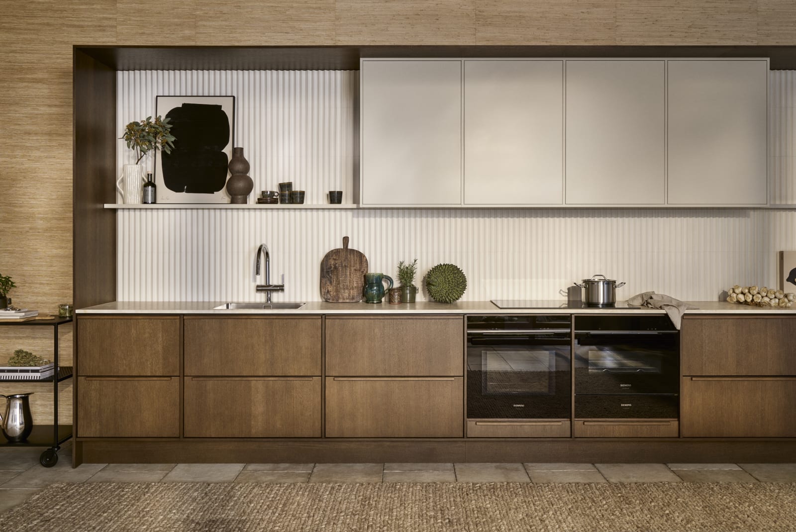 Rundade kanter och nätta väggskåp med räfflad vitrin. Köksdelar med en mer solid design ger en skulptural, elegant känsla där mjukt matchas med hårt för en perfekt balans.