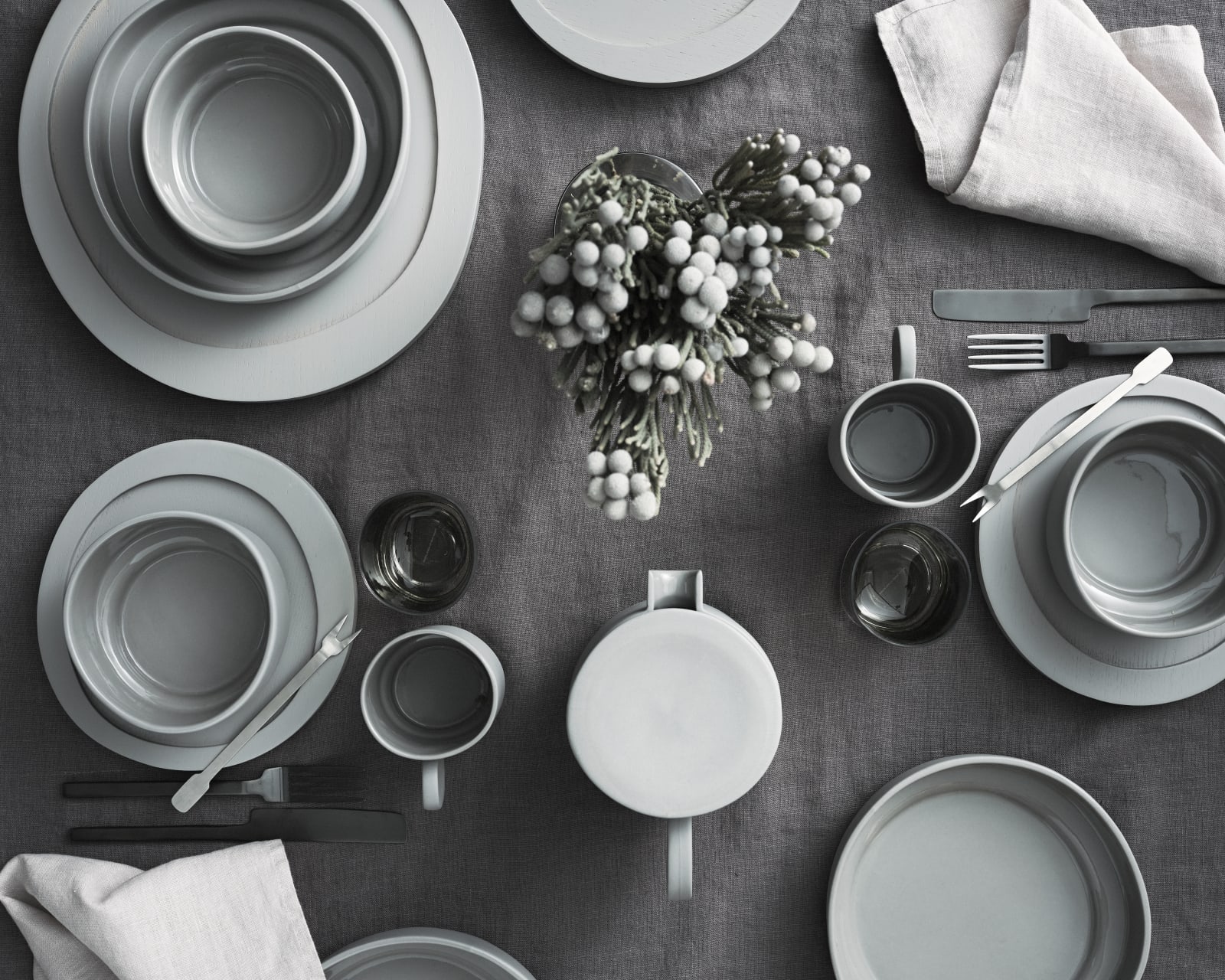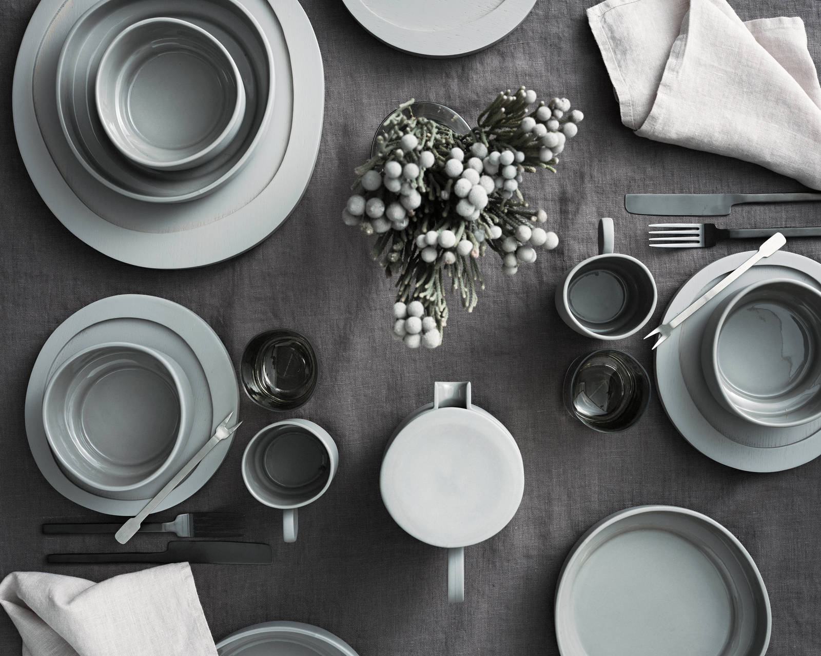 En mörkgrå inramning av ljusare grått porslin med några svarta inslag ger en sober, lite stramare dukning.