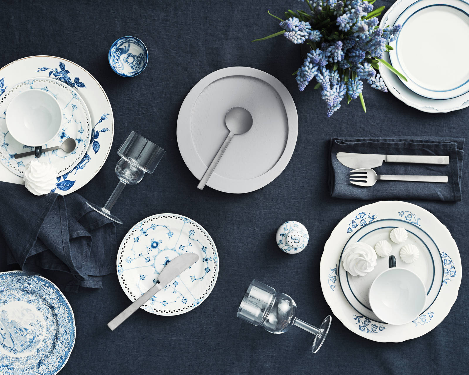 Blå toner i vintageporslin blandat med moderna glas och bestick blir både levande och personligt.