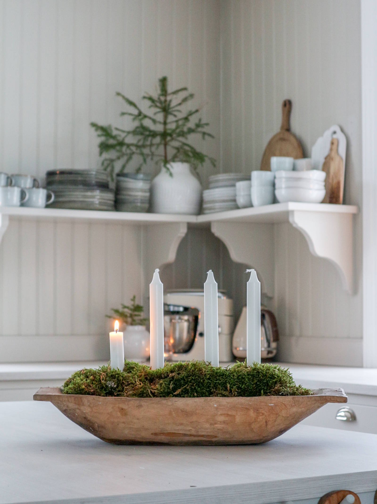 – Vanligtvis brukar jag bara ha vita ljus hemma men i december kan mintgröna ljus få komma fram. Jag gillar att kombinera det mintgröna med en lite mörkare grön, ibland gammelrosa och alltid krämvitt.