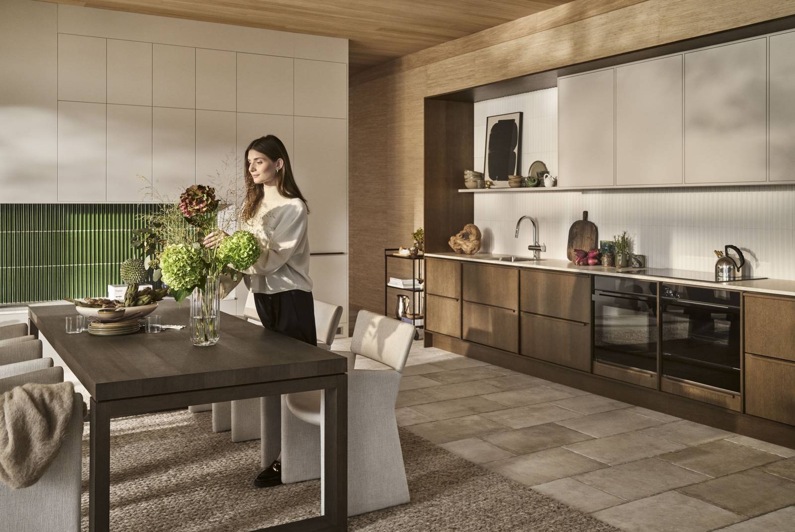 Kökets L-form består av två delar. Med utgångspunkt från den öppna spisen skapades en fondvägg med luckan Arkitekt Plus i färgen Sand. Utrymmet från öppna spisen, under överskåpen, kläddes med ett italienskt kantigt högtstående kakel i grönt. En detalj och ton som flörtar med husets känsla. Handtagen i ek från Signatur Ekbacken är också något som gör stor skillnad och för samman kökets två delar.
