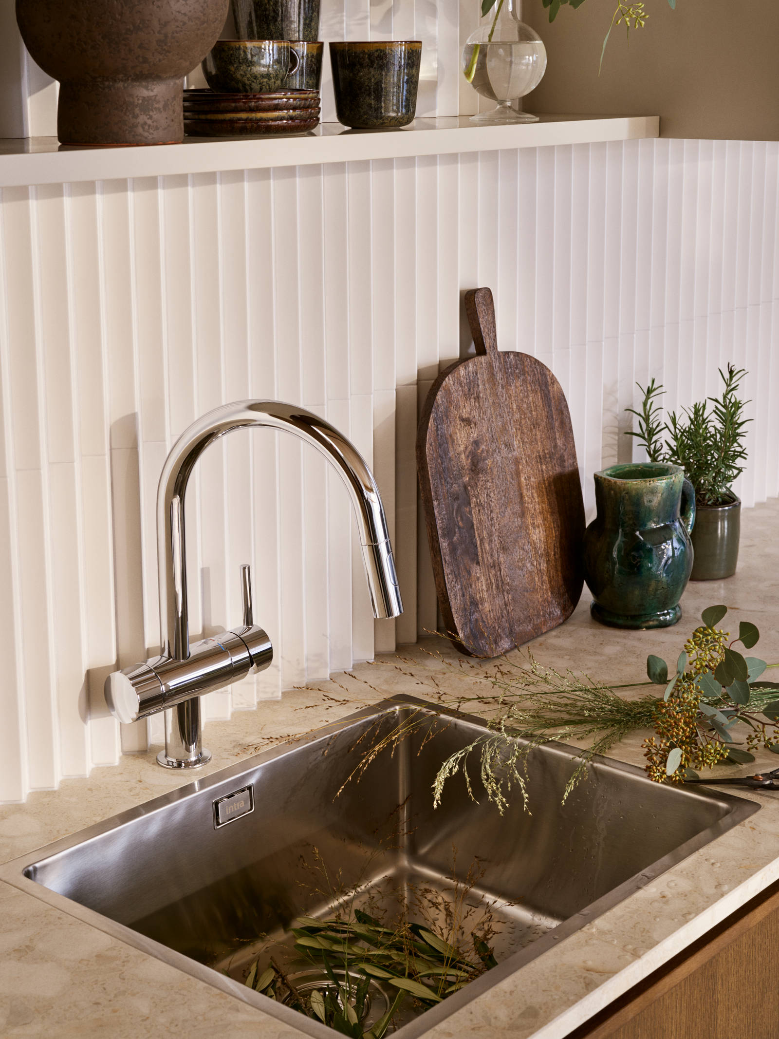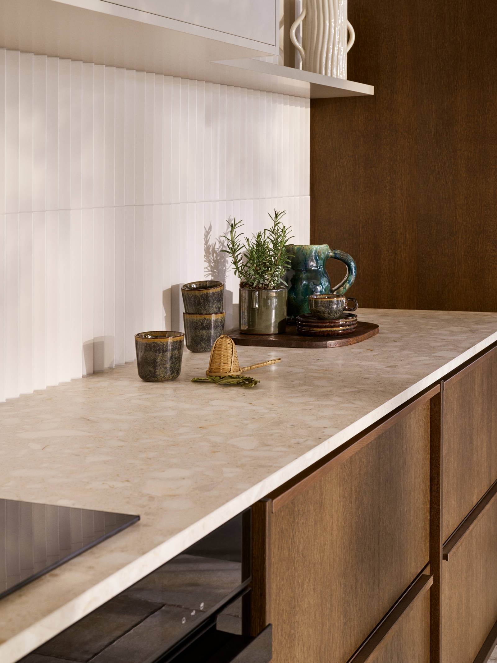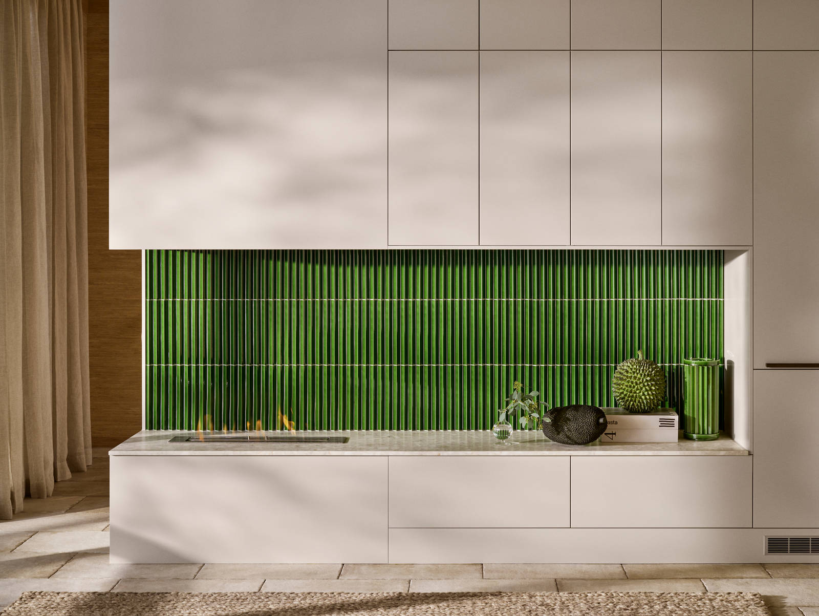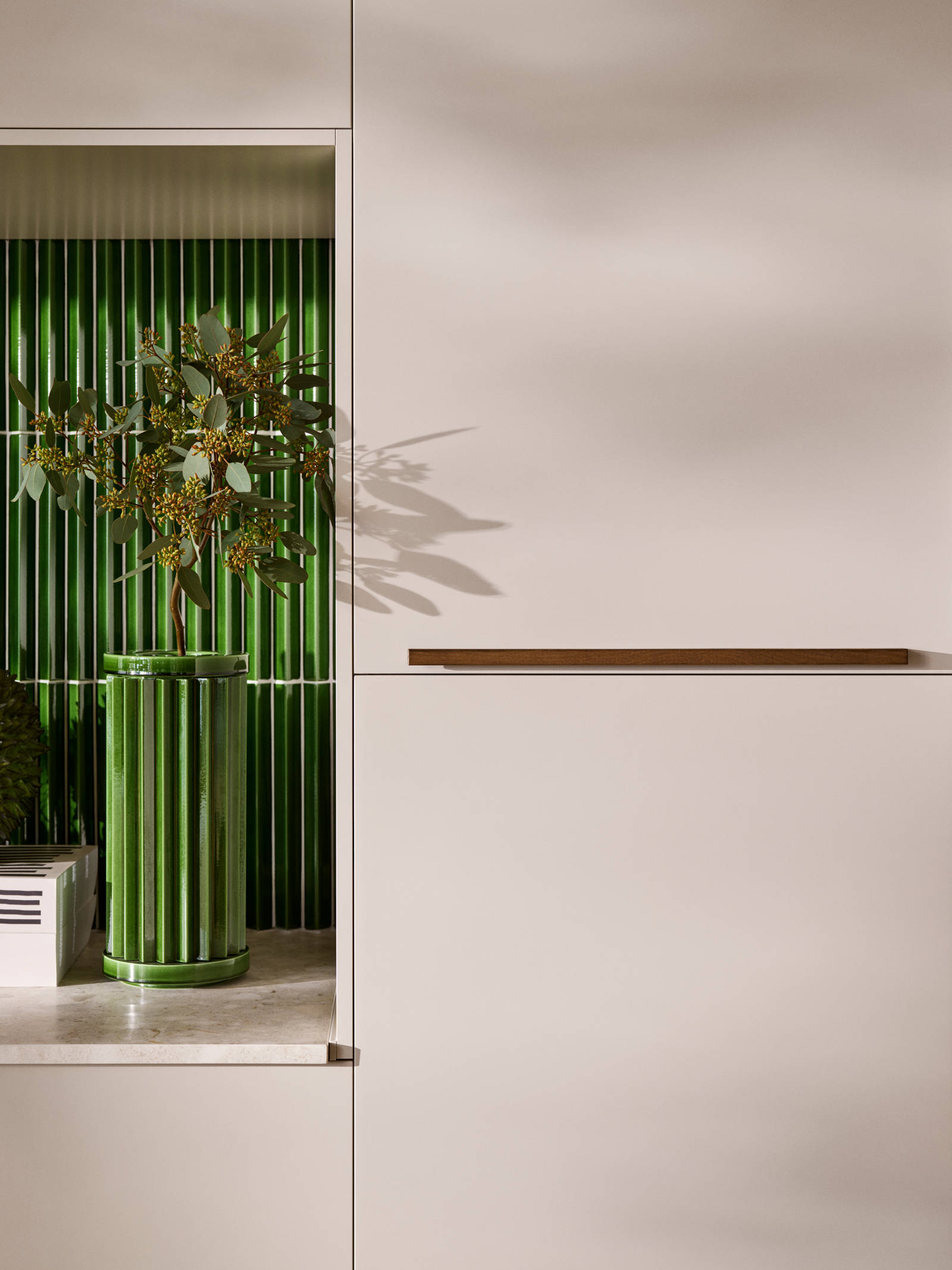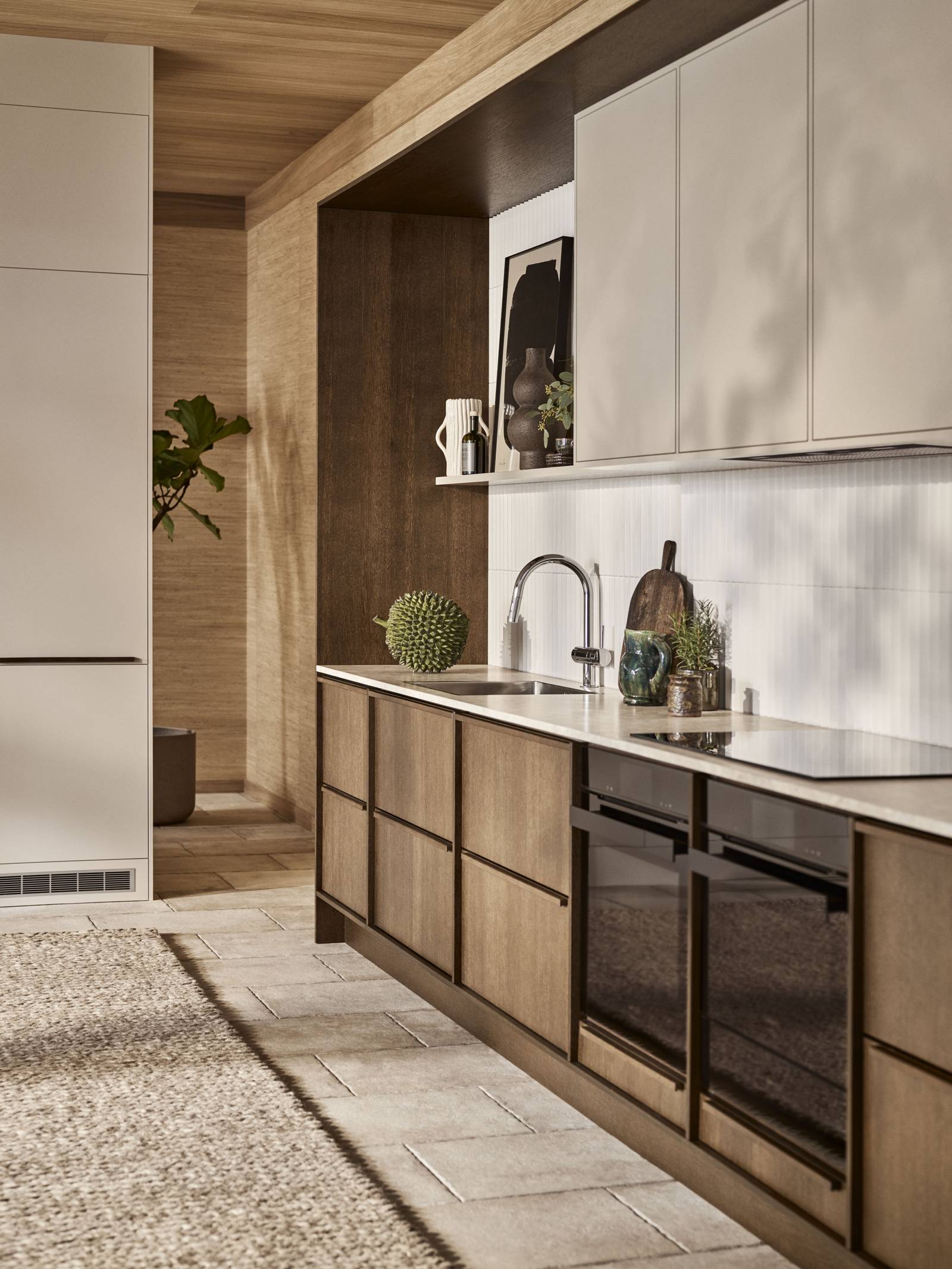 Överskåpen går i Sand med sina öppna hyllor. Här återfinns kaklet från öppna spisen, men här i en matt off white-kulör. Den kanske mest iögonfallande detaljen är den stora ramen runt hela den här sektionen, skapad av Signatur Ekbackens faner. Tanken är att rama in köket, göra det lite mer intimt när det befinner sig i ett större rum.