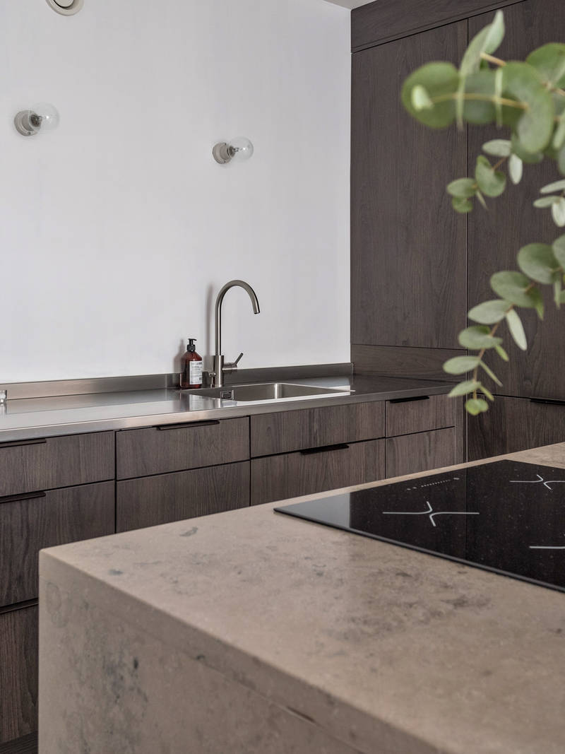 Det här köket har en kombination av natur- och svartbetsad ek inspirerad från Shakerstilen. Den generösa köksön ger arbetsplatser och sociala ytor. Bänkskivan består av tre olika material; rostfritt, kvartskomposit och huggkubb i ek. Smart förvaring återfinns i köksön. Runt köket löper den för shakerstilen karaktäristiska knoppbrädan med plats för redskap och kastruller.