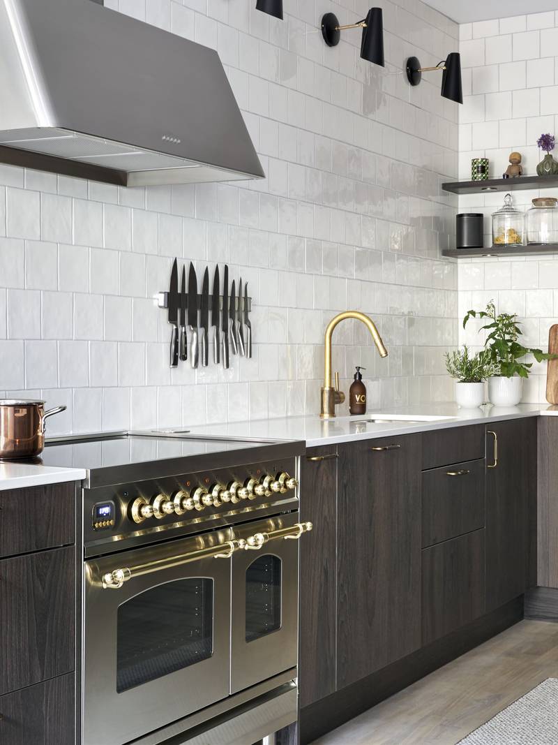 Om du föredrar svarta kök ska du även kika på vår kökslucka Malevik brun som här har inretts i bistrostil. Den takhängda hyllan rymmer alla favoritredskap - allt från kastruller, slevar och kryddgrönt. Med den öppna vägghyllan ges full kontroll på allt annat som behöver finnas nära till hands. Här finns ett rymligt skafferi i det annars så svårutnyttjade hörnet. Med glasade dörrar ger det både översikt och gott om plats för både dryck och torrvaror.