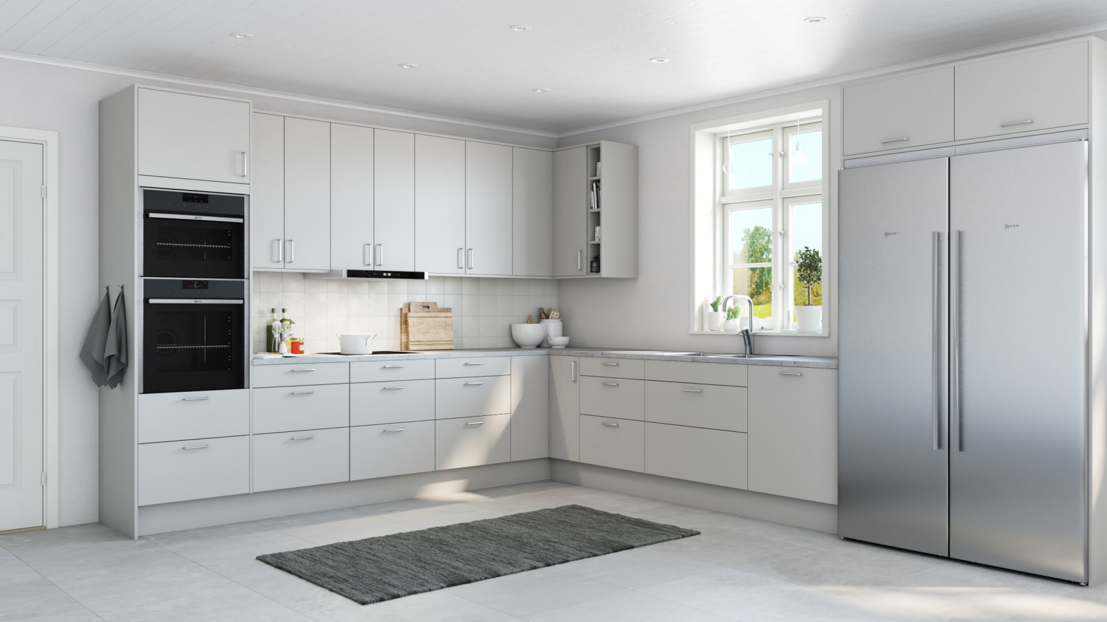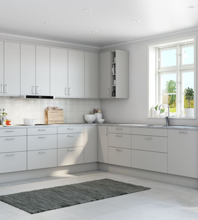 Kökslucka av 19 mm MDF med svagt rundad kant, målad i ljusgrå kulör. Vitrinlucka med klart eller frostat glas. Högskåp har delad lucka i samtliga höjder. Skåpstomme av vit MFC.