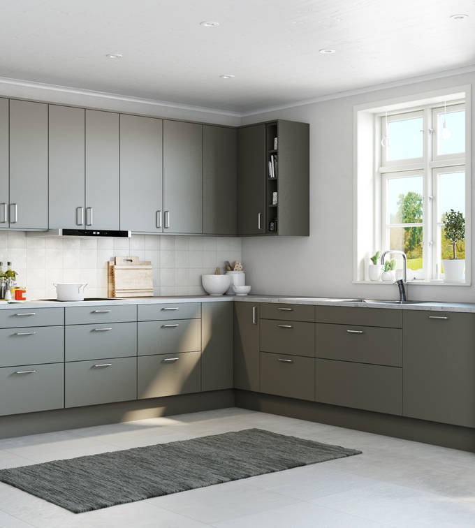 Kökslucka av 19 mm MDF med svagt rundad kant, målad i grön kulör. Vitrinlucka med klart eller frostat glas. Skåpstomme av vit MFC med färganpassad framkant.