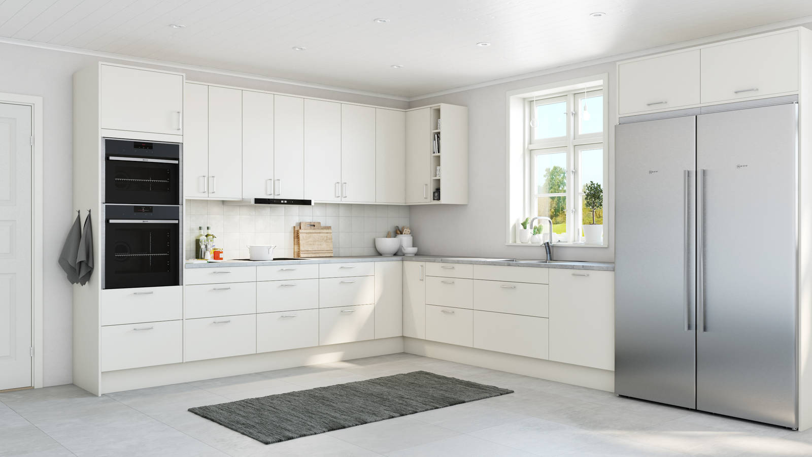Arkitekt är ett prisvärt vitt kök med slät baslucka som är tålig och enkel att underhålla. Den är fin att kombinera med aluvitrin med rökfärgat glas eller svart aluvitrin med rutat glas. Närmast NCS S 0500-N. Glanstal 25 +/- 5.