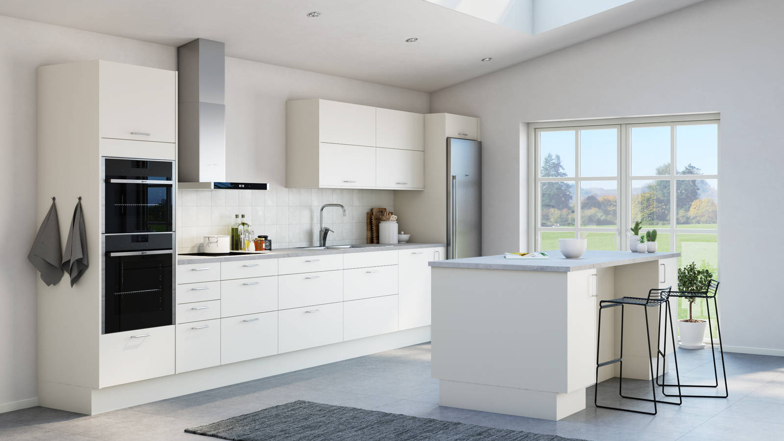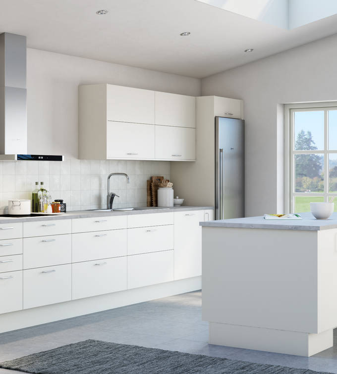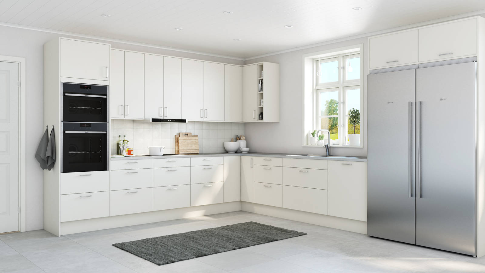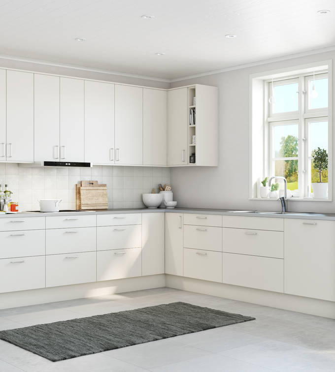 Slät högtryckslaminerad kökslucka med ABS- kantlist. Som vitrinlucka rekommenderas aluvitrin med rökfärgat glas eller svart aluvitrin med rutat glas. Skåpstomme av vit MFC. Närmast NCS S 0500-N.