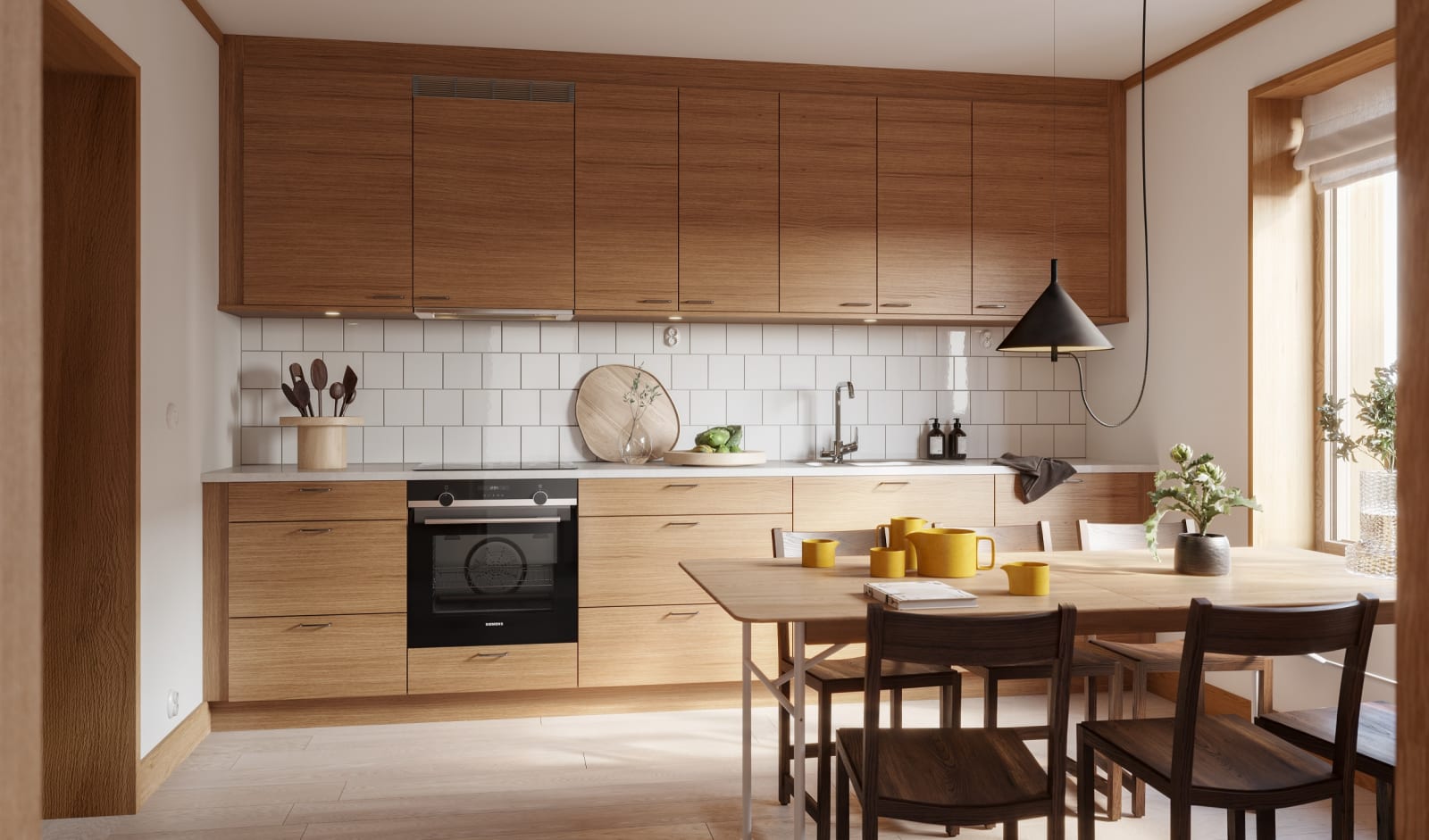 Marbodal är stolt köksleverantör i detta projekt och det Svanenmärkta köket Arkitekt plus ek samt bänkskiva av ljust grå kvartskomposit är standardval i köket. Diskmaskinen är dold bakom snickerilucka och undersidan av väggskåpen har integrerade LED-spotlights som belyser arbetsytorna.
