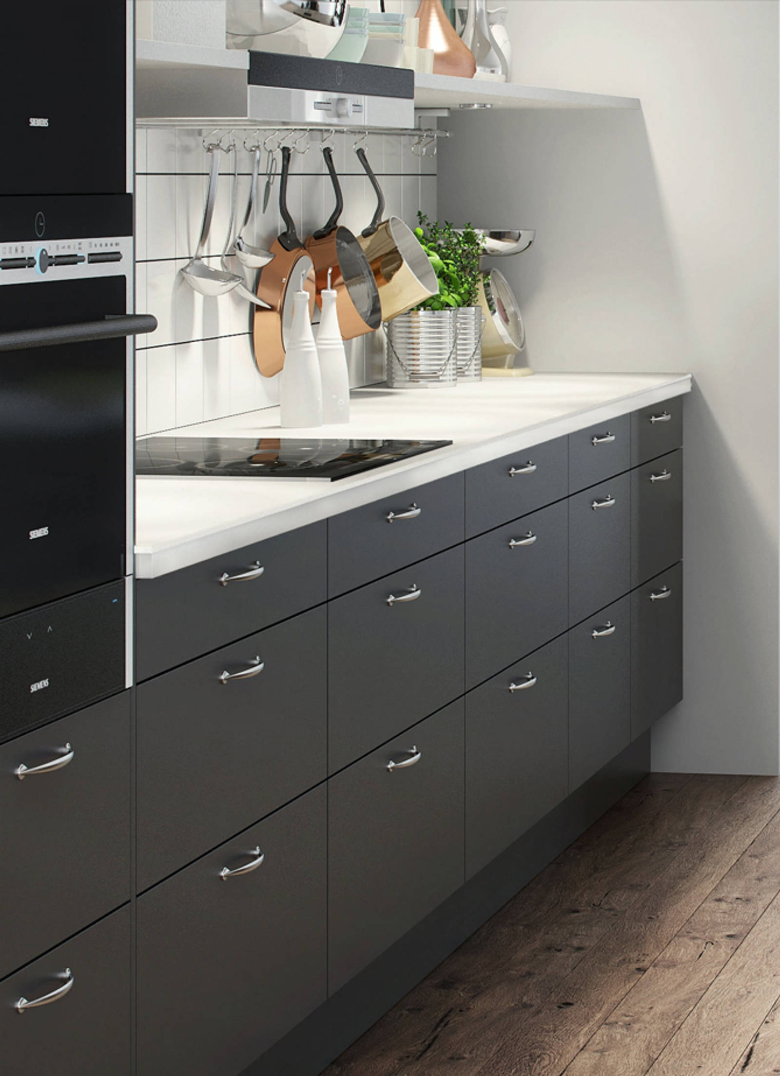 Till bostäderna i Sergelhuset har Marbodal nöjet att leverera den svanenmärkta köksluckan Vinga i kulören Granit med bänkskiva och stänkskydd i kvartskomposit Venato Bianco.