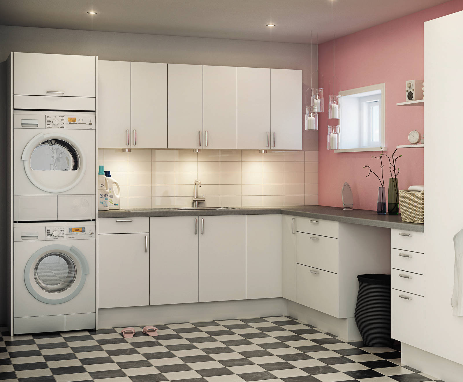 Ljus, praktisk tvättstuga med effektiva arbetsytor och plats för det mesta. Med tvättmaskin och torktumlare på höjden sparar du golvyta. Praktiskt utrymme under bänkskivan för tvättkorg eller som arbetsplats framför symaskinen. Den extra djupa diskhon underlättar vid handtvätt.