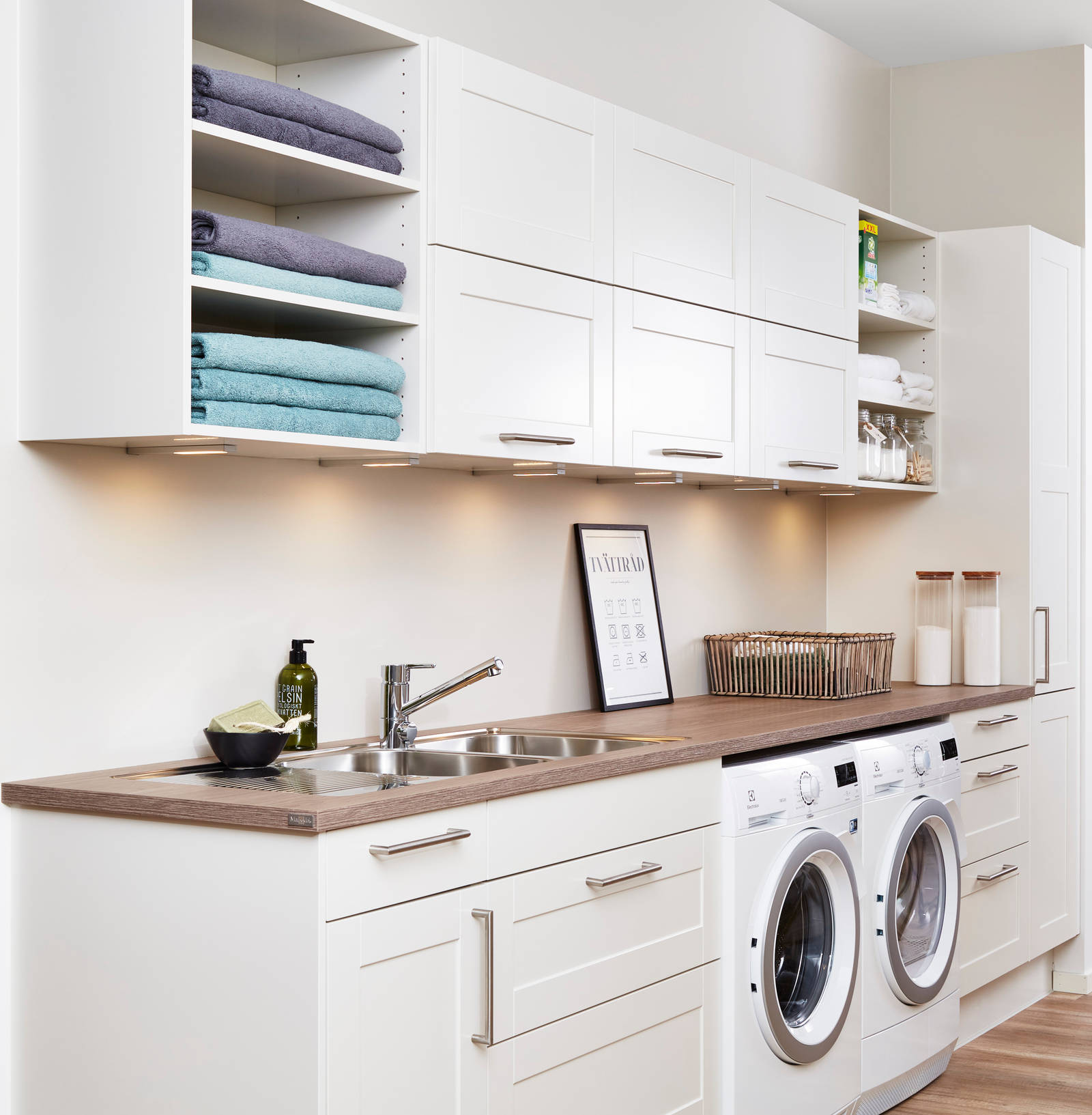 Kombinationen av lådor, skåp och öppna hyllor erbjuder både åtkomst och överblick över det du använder flitigast samtidigt som du kan dölja det du inte vill skall synas. Med en generös, ledbelyst arbetsbänk i tåligt laminat, tillsammans med en rejäl diskho får du en både effektiv, lättarbetad och attraktiv tvättstuga.